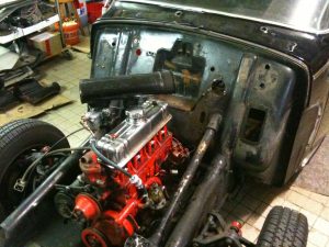 Parallel habe ich den kompletten Innenraum entkernt, also Sitze raus, Teppiche und Verkleidungsteile, sowie alle Schalter und Geräte im Innenraum demontiert. Nun steht er fast „nackt“ dar und wartet auf den Motorausbau. Am schlimmsten war das Zündschloß: Ein kleiner Stift sitzt in „10 Uhr“ von innen am Zündschloß und blockiert den Schließzylinder. Um an den ranzukommen muss der Tacho ein Stück reingedrückt werden. An den kommt man aber erst ran, wenn man Handschuhfach, Radio, diverse Schalter und die Scheibenwischer demontiert hat. Abgesehen davon dass man sich diverse blaue Flecken holt von den Sitzschienen. Also Diebstahlschutz stelle ich mir anders vor.