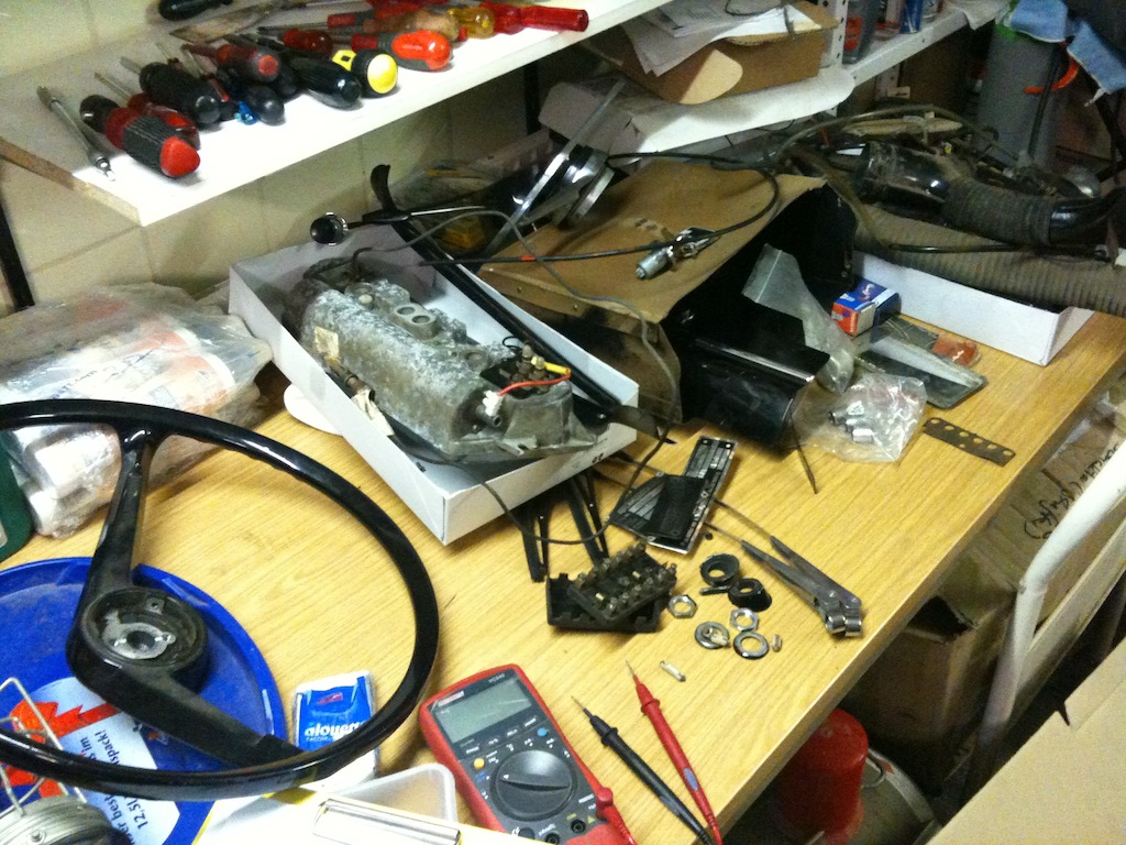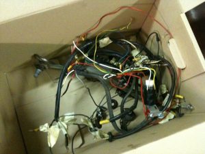 Ich habe mich dann – mit Hilfe von diversen Familienmitgliedern – im Laufe der Woche durch den Kabelsalat gekämpft. Die Elektrik ist „schwer überholungsbedürftig“, da die meisten Kabel älter als ein halbes Jahrhundert sind und das eine oder andere Zusatzgerät (Scheiben-Waschanlage, größere Anlage, Tagfahrlicht, Warnblinker) wurde natürlich einfach irgendwo angeklemmt. Es gibt sogar Stromleitungen ohne Absicherung. Skandalös und brandgefährlich.