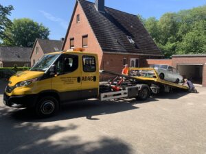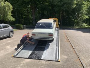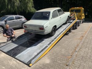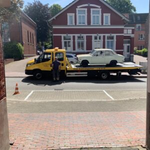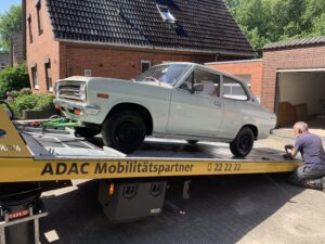 Also wurde der Wagen nicht „verrammscht“, sondern ich habe ihn für einen kleinen Betrag übernommen und werde versuchen ihn zu retten. Die „Bergung“ hat zumindest schonmal funktioniert. Daher die Fotos hier im Beitrag. Ich habe ihn nun erstmal bei mir geparkt. Stay tuned!
